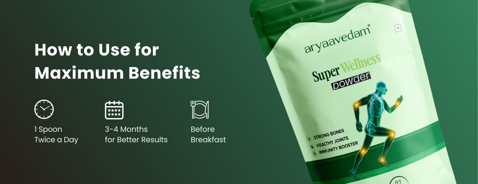 For optimal benefits, use Aryaavedam Super Wellness Powder consistently for at least 60 days.